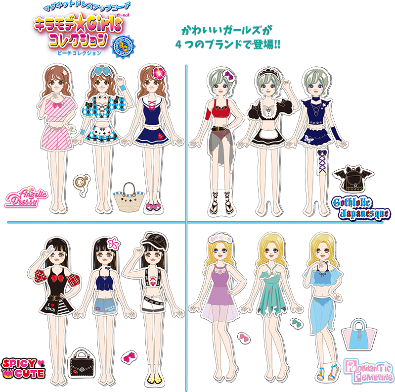 キラモデ★Girlsコレクションのビーチコレクションバージョンが登場!さらに可愛いコーデがいっぱい♪4つのブランドを自由に組み合わせて、オリジナルコーデもできちゃう♪違うバージョンも合わせて遊べるよ。