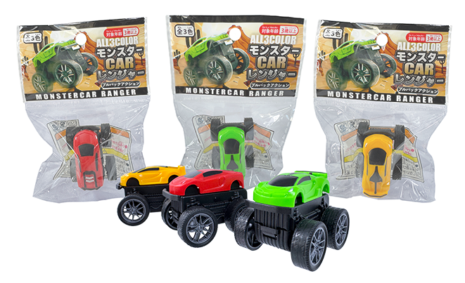 特徴: タイヤが大きいビッグフットタイプのモンスターカーのミニカーがPOPなカラーでカッコよく登場!