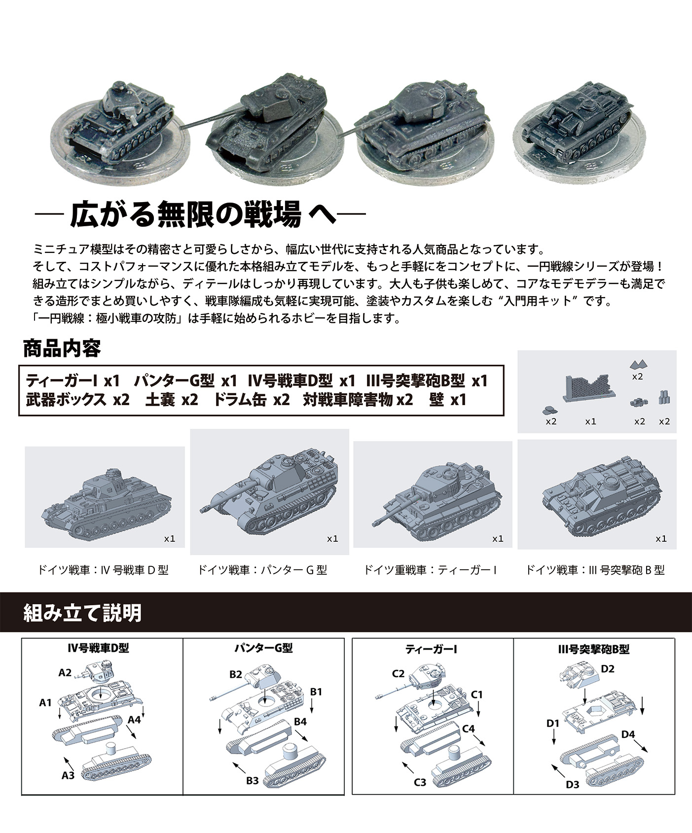 特徴:一円戦線戦車シリーズが登場! 組み立てはシンプルながら、ディテールはしっかり再現しています。子どもでも安心して楽しめ、大人のモデラーも満足できる!